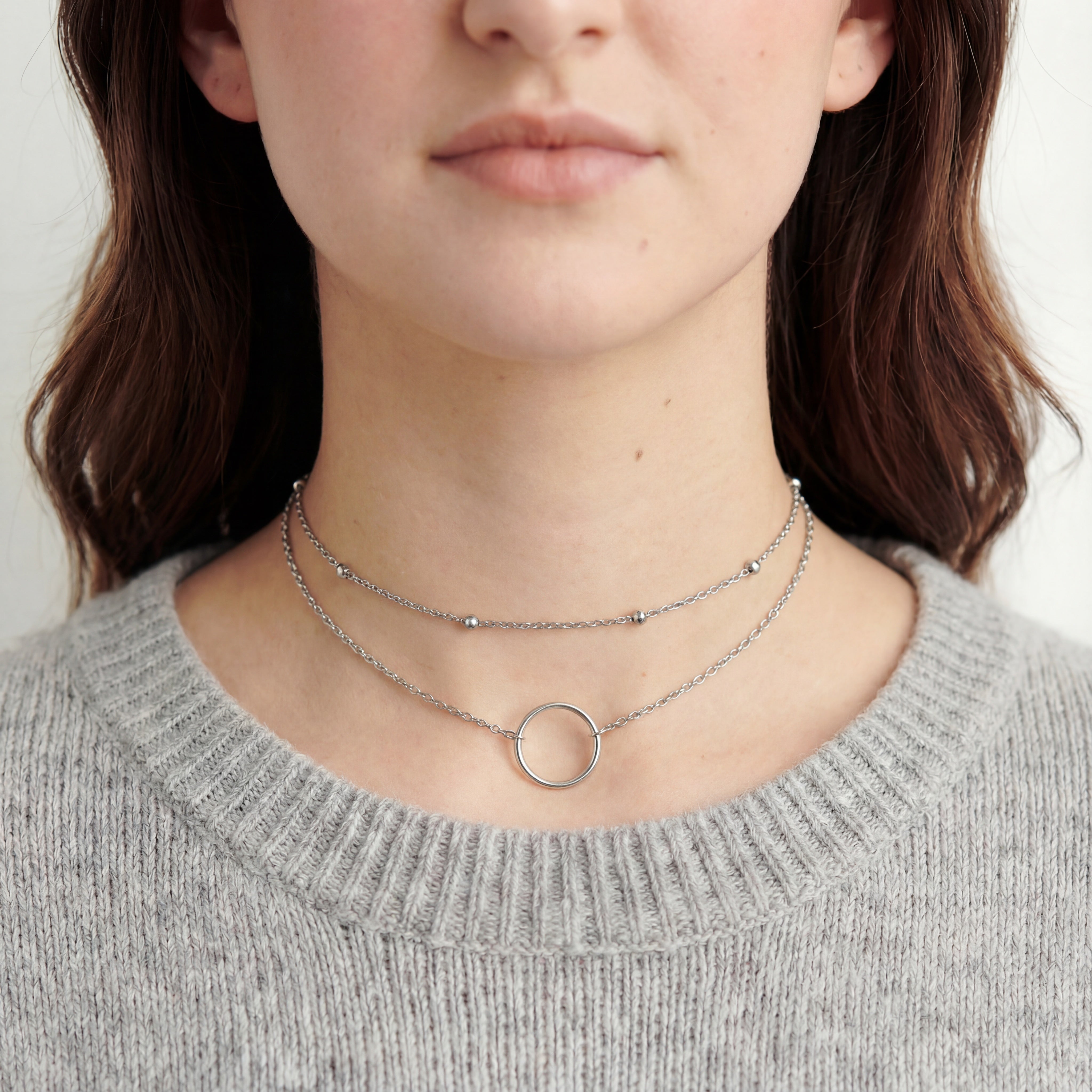 With a choker-style beaded necklace and a simple yet delicate circle on a light chain, this versatile piece will compliment your outfit, no matter what you wear.